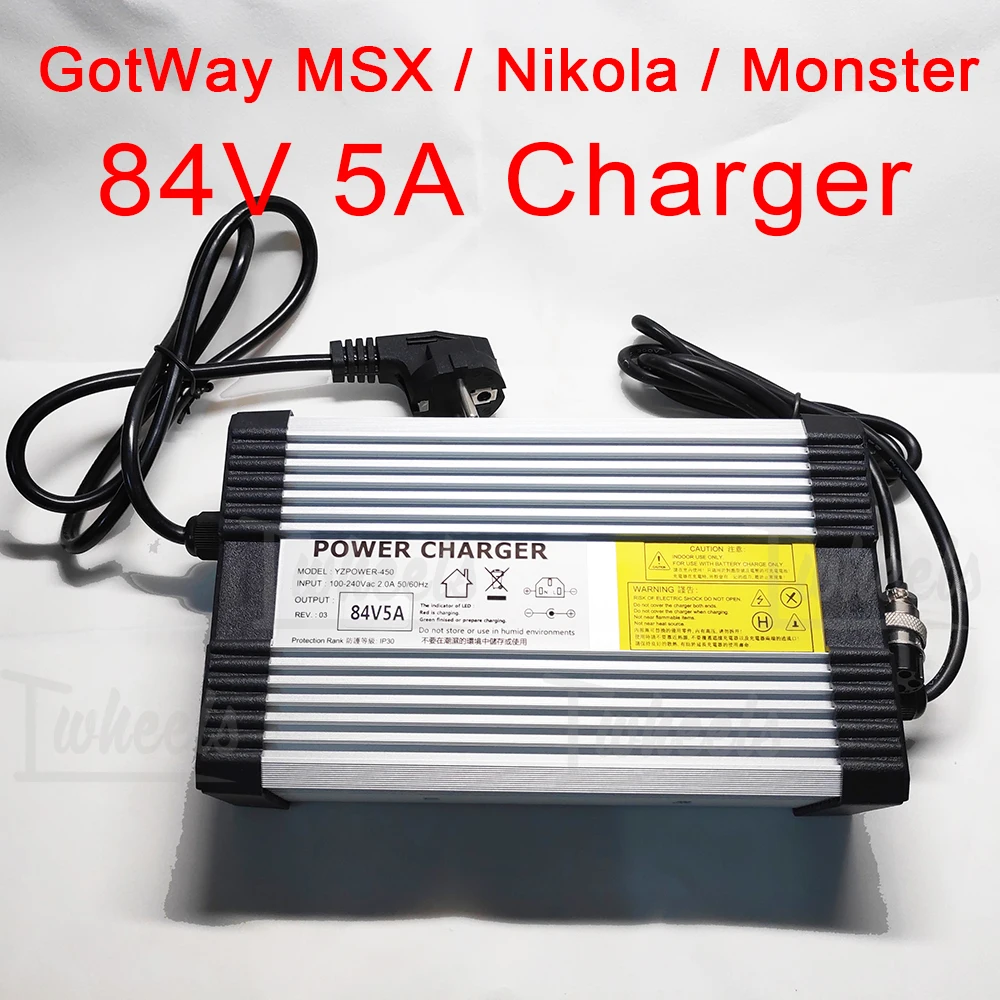 Electric unicycle 84V 5A charger GotWay Nikola Msuper X Monster fast charger fit to GotWay all 84V model EUC Input:100-240Vac 2.0A max 50/60Hz Output: 84V DC 5A